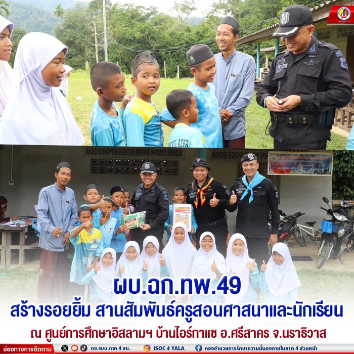 ในการนี้ ได้มีการพูดคุยสอบถามข้อมูลด้านการเรียนการสอน รวมถึงแลกเปลี่ยนความคิดเห็นเพื่อรับทราบปัญหาและความต้องการต่าง ๆ ของสถานศึกษา พร้อมเน้นย้ำความร่วมมือระหว่างหน่วยทหารกับสถาบันการศึกษาในพื้นที่ เพื่อร่วมกันขับเคลื่อนกิจกรรมที่เป็นประโยชน์ ส่งเสริมความเข้าใจอันดี ปลูกฝังอุดมการณ์รักชาติ และมีส่วนช่วยในการป้องกันและแก้ไขปัญหาความรุนแรงในพื้นที่อย่างยั่งยืน นอกจากนี้ หน่วยเฉพาะกิจกรมทหารพรานที่ 49 ยังได้มอบขนมและสิ่งของเล็กๆ น้อยๆ เพื่อสร้างรอยยิ้มและเป็นกำลังใจให้กับเด็กนักเรียนอีกด้วย “ความร่วมมือเล็ก ๆ แต่ยิ่งใหญ่ด้วยใจ หวังสร้างรากฐานแห่งสันติสุขอย่างมั่นคงและยั่งยืนในพื้นที่ปลายด้ามขวานไทย”