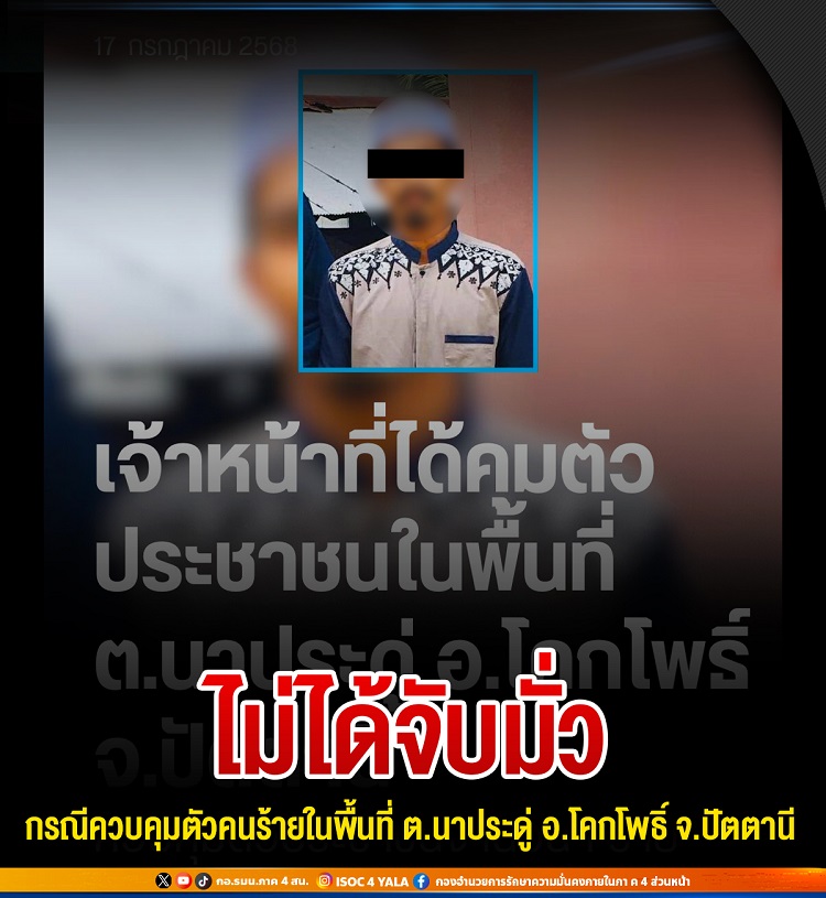 ตามที่เจ้าหน้าที่ได้บังคับใช้กฎหมายในพื้นที่ ตำบลนาประดู่ อำเภอโคกโพธิ์ จังหวัดปัตตานี เมื่อวันที่ 15 กรกฎาคม 2568 เวลา 17.30 น. เจ้าหน้าที่ฝ่ายความมั่นคงได้เข้าควบคุมตัว นาย มูฮัมหมัดคอยรี (สงวนนามสกุล) อายุ 28 ปี ผู้ต้องสงสัยเกี่ยวข้องกับการก่อเหตุรุนแรงในพื้นที่ จชต. โดยเข้าควบคุมตัว ในพื้นที่ตลาดนาประดู่ ตำบลนาประดู่ อำเภอโคกโพธิ์ จังหวัดปัตตานี
