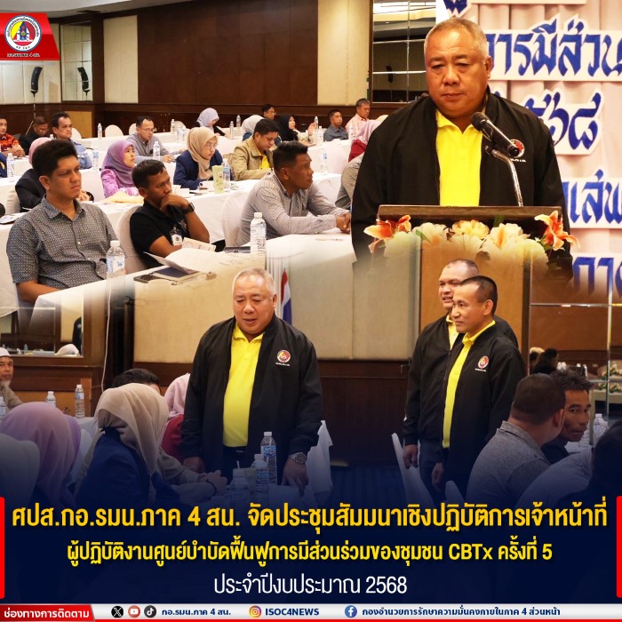 วันที่ 23 กรกฎาคม 2568 เวลา 11.30 น. พลตรี ปกรณ์ จันทรโชตะ ผู้บัญชาการมณฑลทหารบกที่ 42 / ผู้อำนวยการศูนย์ป้องกันและแก้ไขปัญหายาเสพติด กองอำนวยการรักษาความมั่นคงภายในภาค 4 ส่วนหน้า เป็นประธานในพิธีเปิดการประชุมสัมมนาเชิงปฏิบัติการเจ้าหน้าที่ผู้ปฏิบัติงานศูนย์บำบัดฟื้นฟูการมีส่วนร่วมของชุมชน CBTx ครั้งที่ 5 ประจำปีงบประมาณ 2568 โดยมี พันเอก ประสิทธิ์ สุวรรณรัตน์ เสนาธิการ ศูนย์ป้องกันและแก้ไขปัญหายาเสพติด กองอำนวยการรักษาความมั่นคงภายในภาค 4 ส่วนหน้า ให้การต้อนรับ และ พันโท ณรงค์ศักดิ์ เกตสุวรรณ์ ผู้อำนวยการกองนโยบายและแผน ศูนย์ป้องกันและแก้ไขปัญหายาเสพติด กองอำนวยการรักษาความมั่นคงภายในภาค 4 ส่วนหน้า กล่าวต้อนรับพร้อมชี้แจงถึงวัตถุประสงค์ในการจัดกิจกรรมสัมมนาในครั้งนี้ และเชิญวิทยากรจากสำนักงานป้องกันและปราบปรามยาเสพติดภาค 9 โรงพยาบาลธัญญารักษ์สงขลา และผู้อำนวยการกองสันติวิธี ศูนย์สันติวิธี กองอำนวยการรักษาความมั่นคงภายในภาค 4 ส่วนหน้า มาเป็นผู้บรรยายให้ความรู้ โดยมีเจ้าหน้าที่ผู้ปฏิบัติงานศูนย์บำบัดฟื้นฟูการมีส่วนร่วมของชุมชน CBTx ของจังหวัดสงขลา ยะลา ปัตตานี และนราธิวาส เข้าร่วมประชุมสัมมนาอย่างพร้อมเพรียง ณ ห้องประชุมโรงแรมบีพี สมิหลา บีช โฮเต็ล แอนด์ รีสอร์ท ตำบลบ่อยาง อำเภอเมืองสงขลา จังหวัดสงขลา