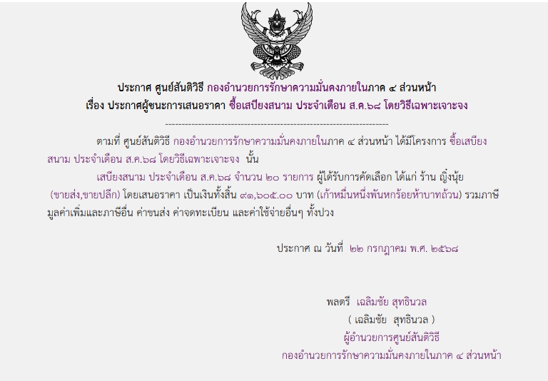 ประกาศผู้ชนะการเสนอราคา ซื้อเสบียงสนาม ประจำเดือน ส.ค.๖๘ โดยวิธีเฉพาะเจาะจง