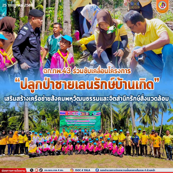 เมื่อวันที่ 24 กรกฎาคม 2568 เวลา 10.00 น. พันเอก กัณต์ฐพัสน์ ดวงมณี รองผู้บังคับหน่วยเฉพาะกิจกรมทหารพรานที่ 43 เป็นประธานในกิจกรรมขับเคลื่อนเครือข่ายสังคมพหุวัฒนธรรม ภายใต้โครงการ “ปลูกป่าชายเลนรักษ์บ้านเกิด” จัดขึ้นโดยชุดปฏิบัติการพลเรือนที่ 12 กองร้อยทหารพรานที่ 4314 หน่วยเฉพาะกิจกรมทหารพรานที่ 43 เพื่ออนุรักษ์และฟื้นฟูระบบนิเวศป่าชายเลนที่เสื่อมโทรม สร้างแนวป้องกันธรรมชาติ ลดแรงคลื่น พายุจากทะเล และป้องกันการกัดเซาะชายฝั่ง อีกทั้งยังเป็นการสร้างแหล่งเพาะพันธุ์และอนุบาลสัตว์น้ำวัยอ่อนอย่างยั่งยืน โดนได้รับความร่วมมือจากกองร้อยหน่วยขึ้นตรงในพื้นที่ ส่วนราชการ ผู้นำชุมชน โรงเรียน และประชาชนในพื้นที่ ร่วมแรงร่วมใจกัน ณ ลานป่าชายเลน ตำบลท่ากำชำ อำเภอหนองจิก จังหวัดปัตตานี