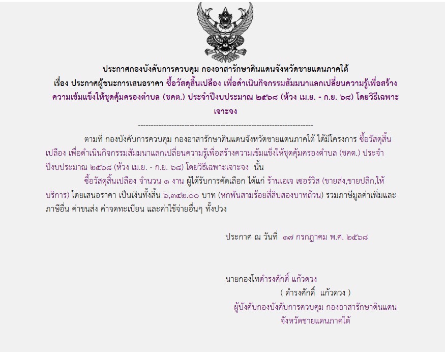 จัดซื้อ จัดจ้างประกาศผู้ชนะการเสนอราคา ประกาศผู้ชนะการเสนอราคา ซื้อวัสดุสิ้นเปลือง เพื่อดำเนินกิจกรรมสัมมนาแลกเปลี่ยนความรู้เพื่อสร้าง ความเข้มแข็งให้ชุดคุ้มครองตำบล (ชคต.) ประจำปีงบประมาณ ๒๕๖๘ (ห้วง เม.ย. – ก.ย. ๖๘) โดยวิธีเฉพาะเจาะจง July 25, 2025 137 Share Facebook Twitter Google+ Telegram LINE