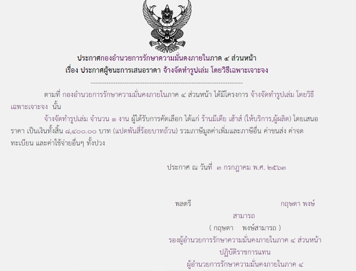 ประกาศผู้ชนะการเสนอราคา จ้างจัดทำรูปเล่ม โดยวิธีเฉพาะเจาะจง(๑)
