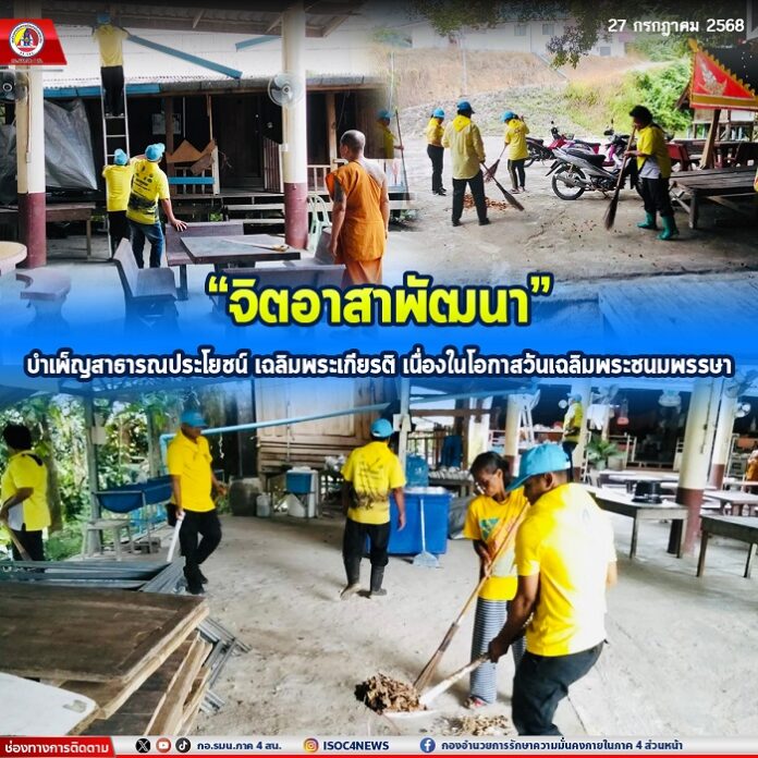 เมื่อวันที่ 26 กรกฎาคม 2568 เวลา 14.00 น. ร้อยเอก สมพงค์ แดงสว่าง ผู้บังคับกองร้อยทหารพรานที่ 4909 หน่วยเฉพาะกิจกรมทหารพรานที่ 49 นำกำลังพลจิตอาสาของหน่วย ร่วมกับผู้นำท้องที่ ผู้นำท้องถิ่น และประชาชนจิตอาสาในพื้นที่ จัดกิจกรรม “จิตอาสาพัฒนา บำเพ็ญสาธารณประโยชน์” เพื่อถวายเป็นพระราชกุศล แด่พระบาทสมเด็จพระวชิรเกล้าเจ้าอยู่หัว เนื่องในโอกาสวันเฉลิมพระชนมพรรษา 73 พรรษา ในวันที่ 28 กรกฎาคม 2568