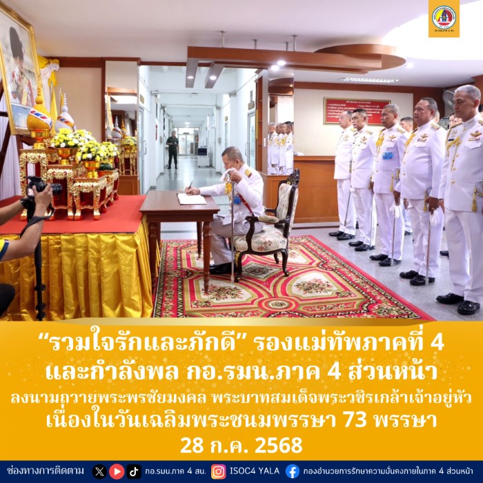วันนี้ (28 กรกฎาคม 2568) เวลา 09.00 น. ที่ ห้องโถง อาคาร 1 กองอำนวยการรักษาความมั่นคงภายในภาค 4 ส่วนหน้า ค่ายสิรินธร ตำบลเขาตูม อำเภอยะรัง จังหวัดปัตตานี พลตรี วรเดช เดชรักษา รองแม่ทัพภาคที่ 4 / รองผู้อำนวยการรักษาความมั่นคงภายในภาค 4 ส่วนหน้า เป็นประธานในพิธีลงนามถวายพระพรชัยมงคล หน้าพระบรมฉายาลักษณ์ พระบาทสมเด็จพระปรเมนทรรามาธิบดีศรีสินทร มหาวชิราลงกรณ พระวชิรเกล้าเจ้าอยู่หัว รัชกาลที่ 10 ในโอกาสวันเฉลิมพระชนมพรรษา 73 พรรษา โดยมี พลตรี พิชิต โชติแก้ว รองผู้อำนวยการรักษาความมั่นคงภายในภาค 4 ส่วนหน้า พร้อมด้วยคณะผู้บังคับบัญชาระดับสูง กองอำนวยการรักษาความมั่นคงภายในภาค 4 ส่วนหน้า ร่วมในพิธีด้วยความสำนึกในพระมหากรุณาธิคุณ