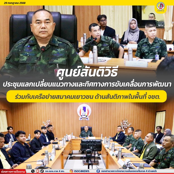 วันนี้ (29 กรกฏาคม 2568) เวลา 09.30 น. ที่ ห้องประชุมศูนย์สันติวิธี (บ้านกรงนก) ค่ายสิรินธร อำเภอยะรัง จังหวัดปัตตานี ศูนย์สันติวิธี กองอำนวยการรักษาความมั่นคงภายในภาค 4 ส่วนหน้า จัดประชุมแลกเปลี่ยนแนวทางและทิศทางการขับเคลื่อนการพัฒนา โดยมี พลตรี เฉลิมชัย สุทธินวล ผู้อำนวยการศูนย์สันติวิธี เป็นประธานการประชุมฯ พร้อมด้วย พลโท ดร.ประภัทร กุลหาบ ที่ปรึกษากองอำนวยการรักษาความมั่นคงภายในภาค 4 ส่วนหน้า, นายอิสกานดา สาแม นายกสมาคมส่งเสริมนักคิด พัฒนาเด็กและเยาวชน เพื่อสันติภาพสลาตัน, นายสุไลมาน เจ๊ะและ นายกสมาคมเพื่อสันติภาพชายแดนใต้ (POSBO) พร้อมเครือข่ายคณะสมาคมฯ ตลอดจน เจ้าหน้าที่ที่เกี่ยวข้องร่วมประชุม
