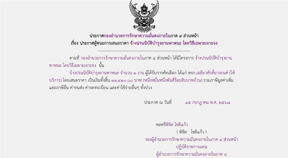 ประกาศผู้ชนะการเสนอราคา จ้างปรนนิบัติบำรุงยานพาหนะ โดยวิธีเฉพาะเจาะจง
