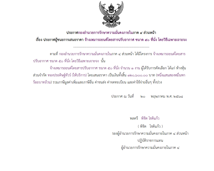 ประกาศผู้ชนะการเสนอราคา จ้างเหมารถยนต์โดยสารปรับอากาศ ขนาด ๕๐ ที่นั่ง โดยวิธีเฉพาะเจาะจง