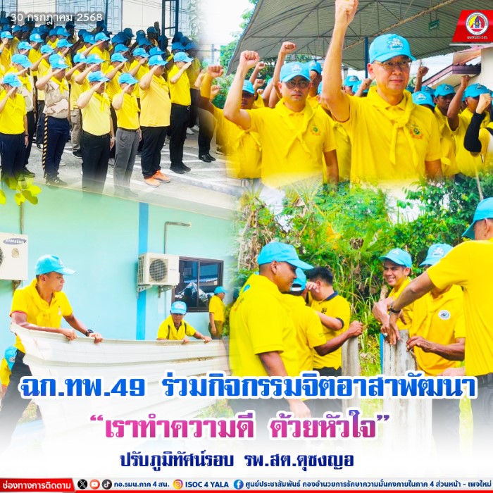 เมื่อวันที่ 29 กรกฎาคม 2568 เวลา 14.00 น. หน่วยเฉพาะกิจกรมทหารพรานที่ 49 โดยการนำของ ร้อยโท วีระ อินแป้น ผู้บังคับกองร้อยทหารพรานที่ 4911 และ ร้อยเอก สุดที่รัก สูงใหญ่ ผู้บังคับกองร้อยทหารพรานที่ 4902 พร้อมด้วยกำลังพลจิตอาสาในสังกัด ร่วมกิจกรรมจิตอาสาพัฒนา “เราทำความดี ด้วยหัวใจ” ณ โรงพยาบาลส่งเสริมสุขภาพตำบลดุซงญอ หมู่ที่ 1 บ้านดุซงญอ ตำบลดุซงญอ อำเภอจะแนะ จังหวัดนราธิวาส