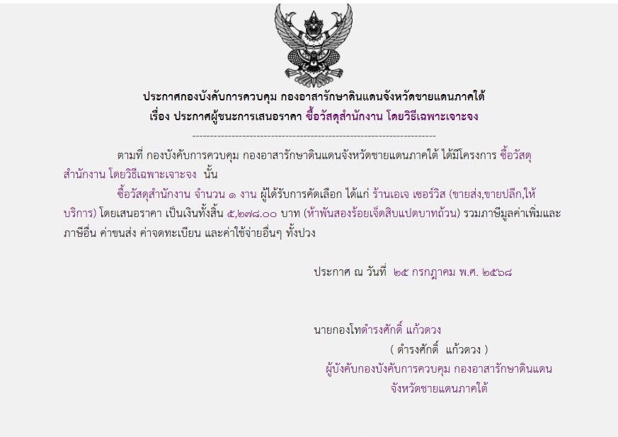 ประกาศผู้ชนะการเสนอราคา ซื้อวัสดุสำนักงาน โดยวิธีเฉพาะเจาะจง