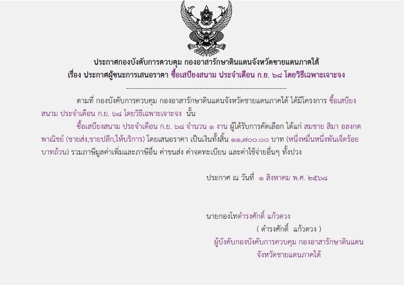 ประกาศผู้ขนะการเสนอราคา ซื้อเสบียงสนาม ประจำเดือน ก.ย. ๖๘ โดยวิธีเฉพาะเจาะจง