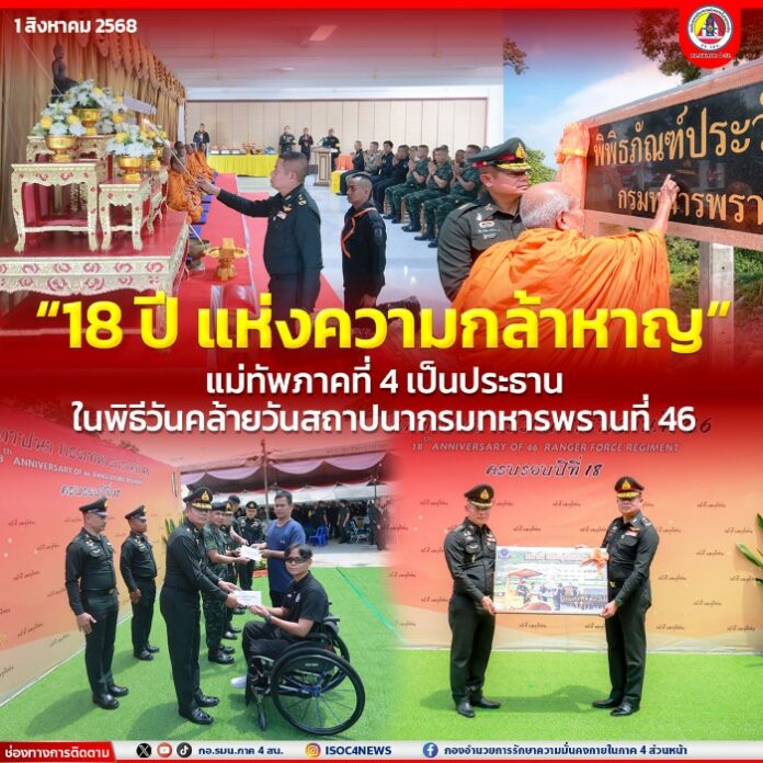 Pada hari ini (1 Ogos 2025), jam 09.40 pagi, di Ibu Pejabat Batalion Renjer Ke-46, Tumpat Kaluwor Nue, Daerah Muang, Wilayah Narathiwat, Leftenan Jeneral Paisan Nusang, Panglima Tentera Wilayah Ke-4 / Pengarah Keselamatan Dalam Negeri Wilayah 4, menjadi pengerusi dalam majlis agama Buddha bagi memohon keberkatan untuk anggota serta memperingati jasa wira-wira yang gugur akibat keganasan di wilayah selatan, sempena ulang tahun ke-18 penubuhan batalion ini. Turut hadir ialah para pegawai dan anggota dengan suasana penuh kehangatan.