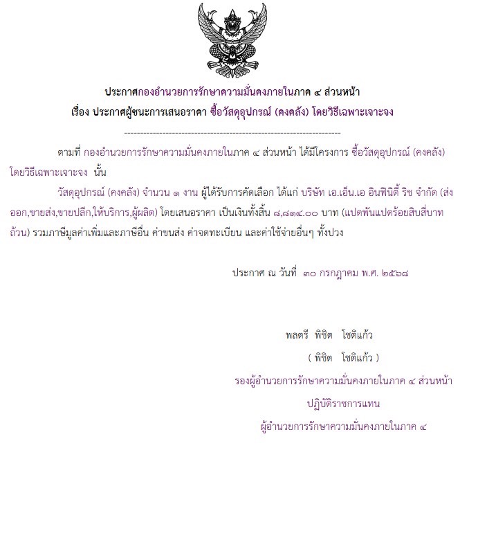 ประกาศผู้ชนะการเสนอราคา ซื้อวัสอุปกรณ์ (คงคลัง) โดยวิธีเลพาะเจาะจง