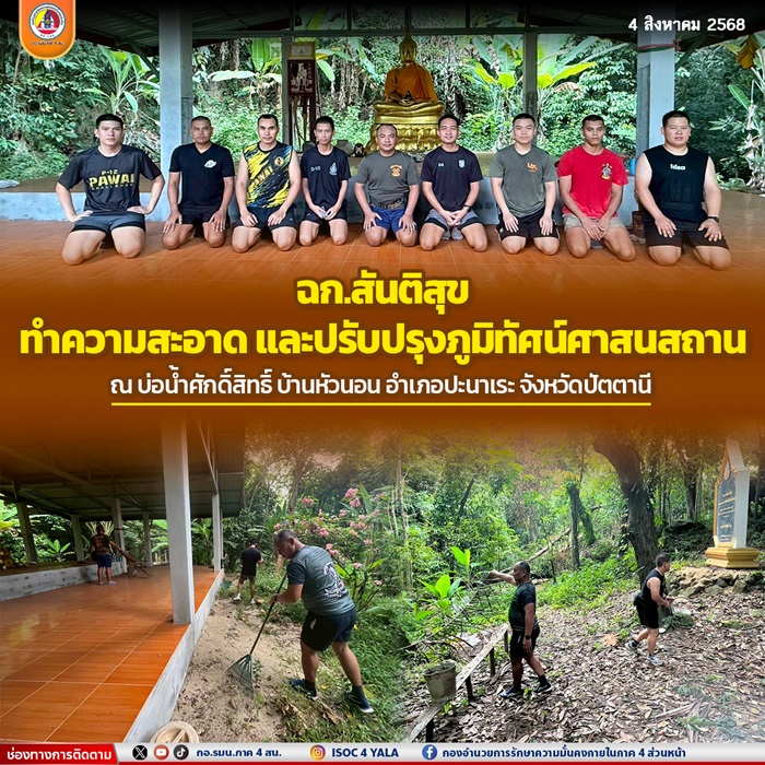 หน่วยเฉพาะกิจสันติสุข โดย ชุดสันติสุขที่ 102 ร่วมกับ ชุดทักษิณสัมพันธ์ที่ 111 ดำเนินการกิจกรรมจิตอาสา ทำความสะอาดและปรับปรุงภูมิทัศน์ศาสนสถาน ณ บ่อน้ำศักดิ์สิทธิ์ บ้านหัวนอน หมู่ที่ 2 ตำบลคอกกระบือ อำเภอปะนาเระ จังหวัดปัตตานี เพื่อพัฒนาภูมิทัศน์ให้มีความสะอาด สวยงาม และเหมาะสมต่อการใช้งานของชุมชน รวมทั้งเป็นการส่งเสริมจิตสำนึกในการอนุรักษ์สิ่งแวดล้อมและสถานที่สำคัญทางวัฒนธรรม ตลอดจนเสริมสร้างความร่วมมือและความสามัคคีระหว่างเจ้าหน้าที่ภาครัฐกับประชาชนในพื้นที่