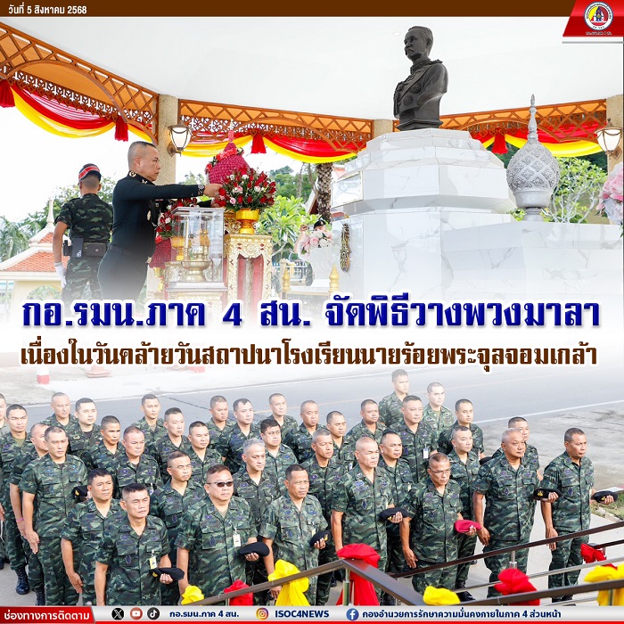Hari ini (5 Ogos 2568), di Dewan Bulatan, Tugu Raja Rama ke-5, Kem Sirindhorn, Wilayah Pattani – Jeneral Waraseth Charoenphon, Timbalan Pengarah Pejabat Risikan Wilayah 4 Bhg. Hadapan, mengetuai majlis letak jambangan bunga sempena Hari Penubuhan Sekolah Tentera Diraja Chulachomklao (Hari Jor Por Ror) yang ke-138. Turut hadir ialah pegawai-pegawai kanan tentera.