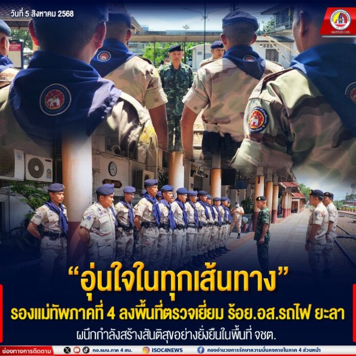 วันที่ 4 สิงหาคม 2568 เวล 10.30 น. ที่สถานีรถไฟยะลา อำเภอเมือง จังหวัดยะลา พลตรี ชาคริต อุจะรัตน รองแม่ทัพภาคที่ 4 / รองผู้อำนวยการรักษาความมั่นคงภายในภาค 4 ส่วนหน้า ลงพื้นที่ตรวจเยี่ยมให้กำลังใจ เจ้าหน้าที่ กองร้อยปฏิบัติการพิเศษที่ 2 กองบัญชาการกองอาสารักษาดินแดน หมวดปฏิบัติการที่ 2 หรือ ร้อย.อส.รถไฟ ประจำสถานีรถไฟยะลา เพื่อสร้างขวัญกำลังใจในการปฏิบัติหน้าที่ และผนึกกำลังในภารกิจดูแลความปลอดภัยให้กับพี่น้องประชาชนที่ใช้บริการการรถไฟแห่งประเทศไทย โดยมี คณะผู้บังคัญชา พร้อมด้วยเจ้าหน้าที่ กองร้อยปฏิบัติการพิเศษที่ 2 กองบัญชาการกองอาสารักษาดินแดน หมวดปฏิบัติการที่ 2 ประจำสถานีรถไฟยะลา ให้การต้อนรับด้วยความอบอุ่น