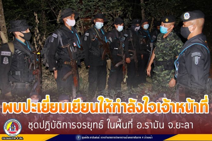 ทั้งนี้ ในการปฏิบัติงานของเจ้าหน้าที่ชุดปฏิบัติการจรยุทธ์ในแต่ละภารกิจ ผู้บังคับหน่วยเฉพาะกิจยะลา ได้เน้นย้ำการปฏิบัติในการรักษาความปลอดภัยในพื้นที่ให้มีความปลอดภัย และการติดตามพฤติกรรมกลุ่มเครือญาติผู้ก่อเหตุรุนแรง เน้นตามนโยบาย/สั่งการของผู้อำนวยการรักษาความมั่นคงภายในภาค 4 พร้อมทั้งให้คำแนะนำเกี่ยวกับหลักการปฏิบัติทางยุทธวิธี เพื่อให้กำลังพลมีความเข้าใจและระมัดระวัง ไม่ให้เกิดความประมาทในการปฏิบัติภารกิจ และสามารถดูแลความปลอดภัยให้กับประชาชน รวมทั้งควบคุมพื้นที่รับผิดชอบได้อย่างปลอดภัย และได้มอบเครื่องอุปโภคบริโภคให้กับกำลังพล เพื่อเป็นขวัญและกำลังใจในการปฏิบัติหน้าที่ในพื้นที่อำเภอรามัน จังหวัดยะลา