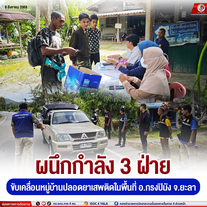 Three-Sector Collaboration Mobilizes Drug-Free Village Initiative in Krong Pinang District, Yala Province On August 7, 2022, the 47th Ranger Regiment Task Force, led by Lieutenant Chaiyawat Rattanapon, Company Commander of Ranger Company 4714, deployed personnel in coordination with Mr. Utan Saisin, Subdistrict Chief of Sa-e, police officers from Krong Pinang Police Station, district public health officials, and local community leaders to implement activities under the project titled “Safe and Drug-Free Community Villages”—a government initiative aimed at proactively addressing drug-related issues. The operation involved establishing checkpoints and roadblocks in key areas, along with conducting random drug tests among male youth groups. These efforts focused on screening, prevention, and raising awareness of the dangers associated with drug use. The initiative was well-received and actively supported by the local population. This operation represents a collaborative effort among three key sectors—the military, civil authorities, and the local community—to carry out drug prevention and suppression strategies aligned with the concept of “No Drug Dealers – Zero Tolerance for Drug Trafficking in the Area.” Operations were carried out in two villages: Ban Batu Bula (Village No. 2) and Ban Pajaeng (Village No. 5), Sa-e Subdistrict, Krong Pinang District, Yala Province. This initiative marks a significant step toward establishing “strong, resilient, and drug-free villages” as a foundation for long-term community security. It also highlights the strength of multi-sectoral cooperation in addressing drug issues sustainably and effectively. #DrugFreeCommunities#UnitedAgainstDrugs#9GoodVillageCharter#NoToBRN#NoToViolenceInTheDeepSouth#4thArmyRegionCommander#CommanderPaisan#PublicRelationsCenter#InternalSecurityOperationsCommandRegion4Front