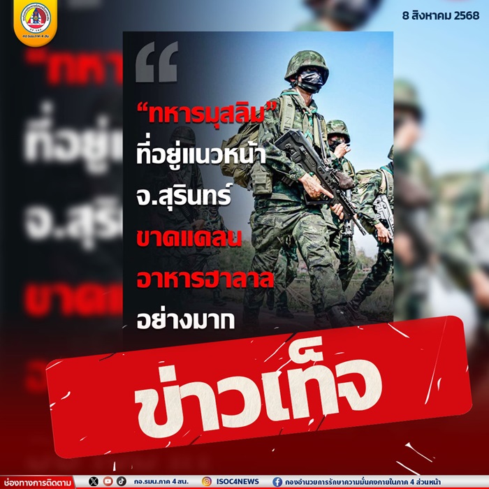 จากการตรวจสอบข้อเท็จจริงกับกองทัพบกและกองทัพภาคที่ 2 ต่างได้รับการยืนยันว่า ไม่มีปัญหาการขาดแคลนอาหารในพื้นที่ปฏิบัติการ โดยเฉพาะอาหารฮาลาล ซึ่งได้จัดเตรียมไว้อย่างเหมาะสม ครบถ้วน และเป็นไปตามหลักศาสนาอิสลามอย่างเคร่งครัด เพื่อดูแลทหารทุกนายอย่างเท่าเทียม ไม่ว่าจะนับถือศาสนาใด และขอให้ประชาชนโปรดใช้วิจารณญาณในการรับข้อมูลข่าวสาร และหลีกเลี่ยงการส่งต่อข้อมูลจากแหล่งที่ไม่ชัดเจน โดยเฉพาะในประเด็นที่อาจสร้างความเข้าใจผิด หรือทำให้ประชาชนเกิดความสับสน