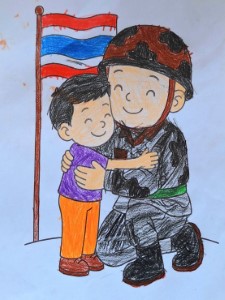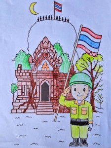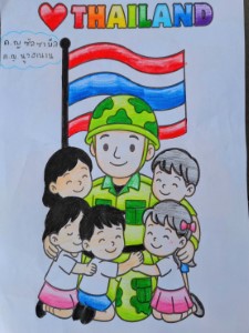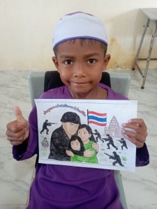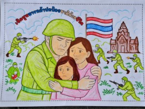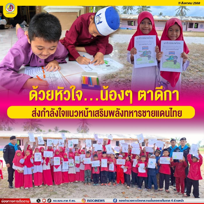 Dalam suasana tegang di sempadan Thailand-Kemboja, kanak-kanak dari Pusat Pendidikan Islam di masjid (Tadika) dalam kawasan tanggungjawab Unit Tindakan Khas Batalion Tentera Renjer ke-44 tetap bersatu hati, melukis dan menulis kata-kata semangat untuk dihantar terus kepada abang-abang tentera yang bertugas mempertahankan tanah air Thailand dengan hati yang berani. Anak-anak muda di kampung juga mula sedar dan faham tugas penting tentera sempadan, mencerminkan kesedaran dan sokongan terhadap peranan tentera dalam menjaga kedaulatan negara, serta mengeratkan hubungan antara rakyat dan kerajaan.