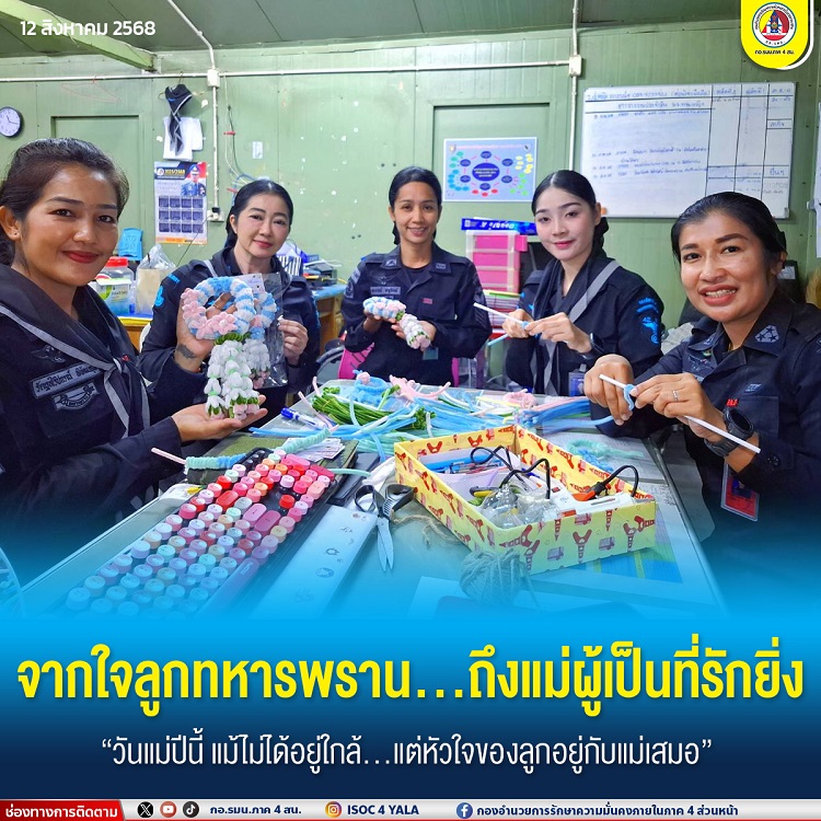 Apabila Hari Ibu semakin dekat, ramai yang sediakan bunga melur, pelukan, dan kata-kata cinta untuk ibu. Tapi bagi kami… anak-anak yang bertugas di sempadan Selatan, ada yang tak dapat balik kampung, tak dapat peluk ibu pada hari yang penting ini. Namun hati kami tetap penuh kasih sayang dan rasa hormat yang mendalam. Oleh itu, pada 11 Ogos 2568 jam 10.00 pagi, Unit Khas Batalion Tentera Renjer 42, di bawah pimpinan Kolonel Sanrat Nilsa-lap, telah mengadakan aktiviti membuat kalung bunga Hari Ibu di markas utama, Kampung Pikul, Mukim Khuan, Daerah Panare, Wilayah Pattani, untuk anak-anak tentera ini hadiahkan kepada ibu — walaupun mungkin dihantar melalui pos atau disertakan bersama surat cinta.