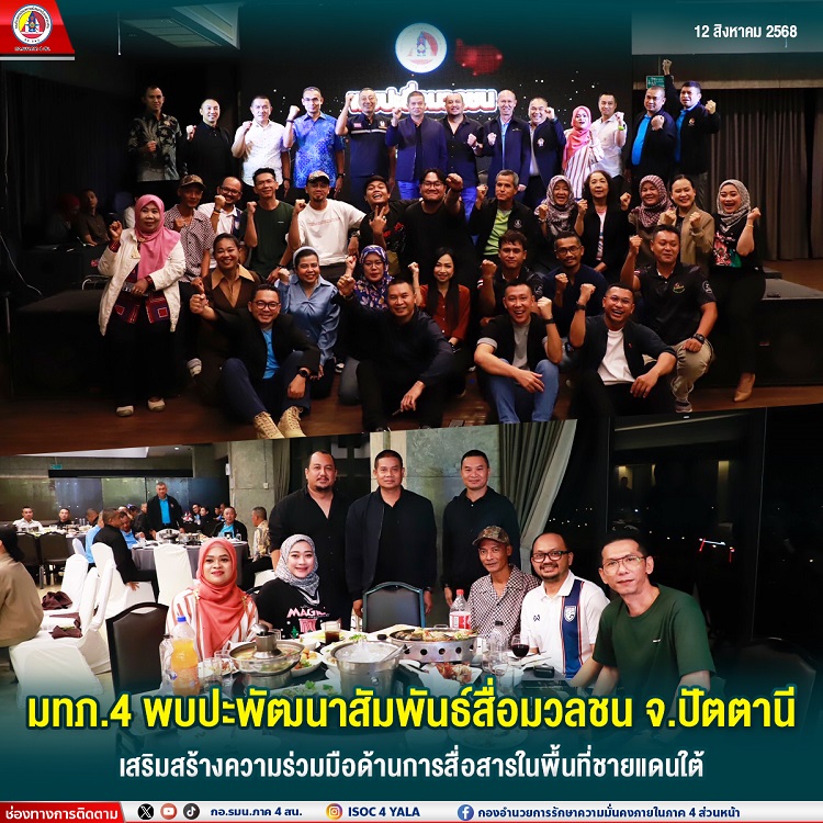 On August 11, 2025, at 7:00 PM, at the Southern View Hotel in Mueang District, Pattani Province, Lieutenant General Paisan Nusang, Commander of the Fourth Army Region and Director of the Internal Security Operations Command Region 4 (ISOC Region 4), along with Major General Korakot Puchot, Deputy Director of ISOC Region 4 Forward Command, and senior officers, attended a media engagement event titled “Strengthening Relations with Media in the Southern Border Provinces” for Fiscal Year 2025.