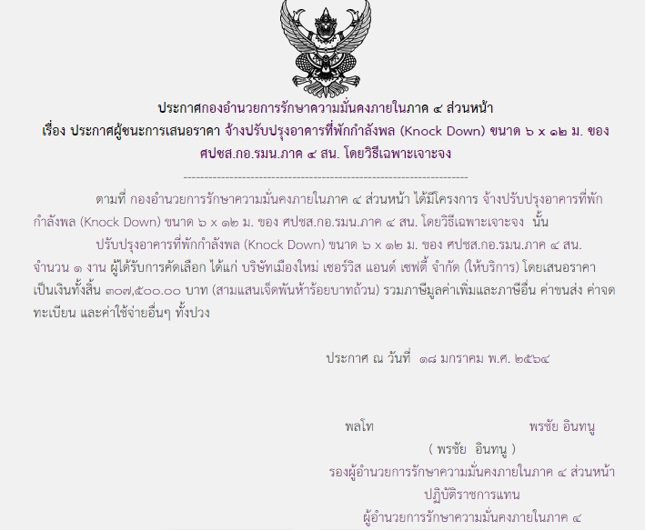 ประกาศผู้ชนะการเสนอราคา จ้างปรับปรุงอาคารที่พักกำลังพล (Knock Down) ขนาด ๖ x ๑๒ ม. ของ ศปชส.กอ.รมน.ภาค ๔ สน.โดยวิธีเฉพาะเจาะจง (307,500.00)