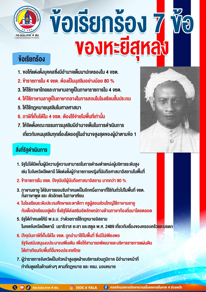 - ขอให้แต่งตั้งบุคคลซึ่งมีอำนาจเต็มมาปกครองใน 4 จังหวัดชายแดนภาคใต้