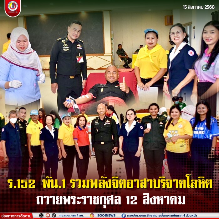 เมื่อวันที่ 14 สิงหาคม 2568 เวลา 09.00 น. ณ ห้องประชุมกองร้อยอาวุธเบาที่ 1 ค่ายพยัคฆ์ กองพันทหารราบที่ 1 กรมทหารราบที่ 152 ตำบลถ้ำทะลุ อำเภอบันนังสตา จังหวัดยะลา พันโทอิสระพงค์ บุญมา ผู้บังคับกองพันทหารราบที่ 1 กรมทหารราบที่ 152 นำกำลังพลของหน่วย พร้อมด้วยสมาคมแม่บ้านทหารบก สาขา ร.152 พัน.1, ชุดปฏิบัติการกิจการพลเรือนประจำอำเภอ, ครูและนักเรียนโรงเรียนธารโตวัฑฒนวิทย์ (โรงเรียนเด่นประจำอำเภอของหน่วย) และสภากาชาดไทย ร่วมกิจกรรม “บริจาคโลหิต ให้เลือด ให้ชีวิต”
