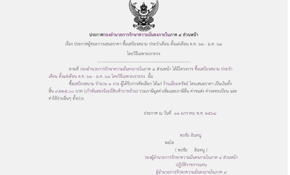 จัดซื้อ จัดจ้างประกาศผู้ชนะการเสนอราคา ประกาศผู้ชนะการเสนอราคา ซื้อเสบียงสนาม ประจำเดือน ตั้งแต่ ต.ค.๖๓ – ม.ค.๖๔ โดยวิธีเฉพาะเจาะจง (9,225.00) January 20, 2021 998 Share Facebook Twitter Google+ Telegram LINE สกบ.กอ.รมน.ภาค 4 สน.