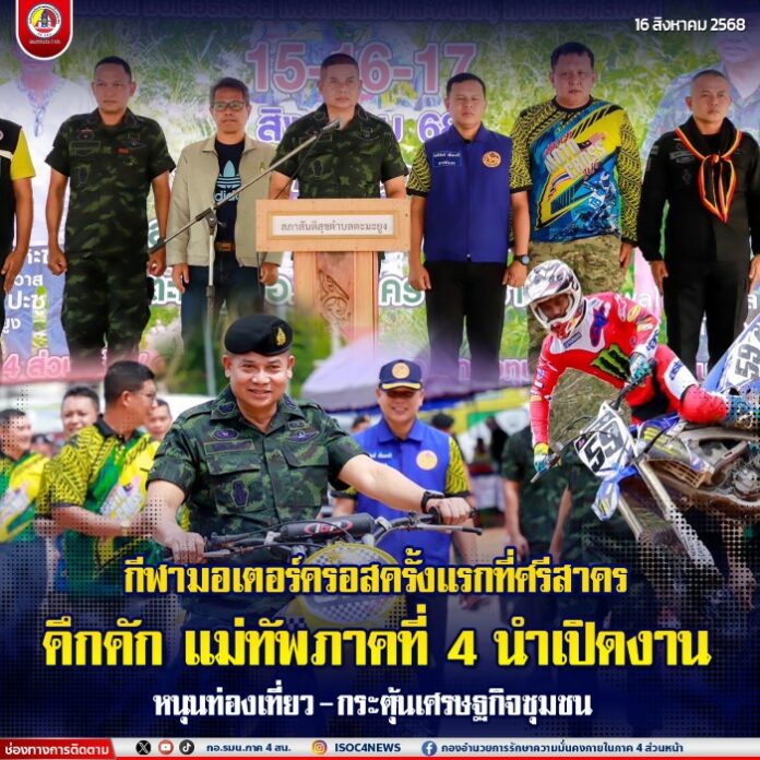 วันนี้ (16 สิงหาคม 2568) เวลา 13.30 น. ที่สนามจือแรงมอเตอร์ครอส ตำบลตะมะยูง อำเภอศรีสาคร จังหวัดนราธิวาส พลโท ไพศาล หนูสังข์ แม่ทัพภาคที่ 4/ผู้อำนวยการรักษาความมั่นคงภายในภาค 4 เป็นประธานเปิดกิจกรรมการแข่งขัน “จือแรงมอเตอร์ครอส ครั้งที่ 1” โดยมีหัวหน้าส่วนราชการ นายอำเภอศรีสาคร ผู้บังคับหน่วยเฉพาะกิจ กำนัน ผู้ใหญ่บ้าน ผู้นำท้องที่ ผู้นำท้องถิ่น และประชาชนเข้าร่วมอย่างคึกคัก