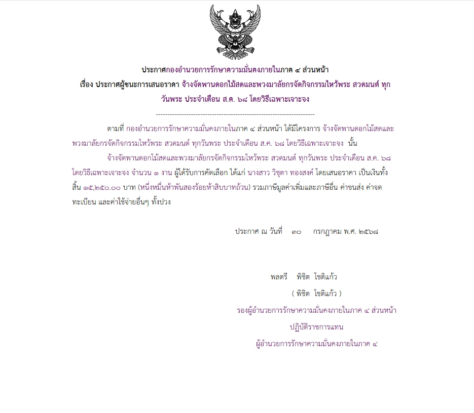 จัดซื้อ จัดจ้างประกาศผู้ชนะการเสนอราคา ประกาศผู้ชนะการเสนอราคา จ้างจัดพานดอกไม้สดและพวงมาลัยกรจัดกิจกรรมไหว้พระ สวดมนต์ ทุกวันพระ ประจำเดือน ส.ค. ๖๘ โดยวิธีเฉพาะเจาะจง August 20, 2025 268 Share Facebook Twitter Google+ Telegram LINE