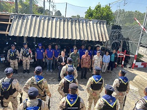 ในการนี้ นายธีรวิทย์ เฑียรฆโรจน์ ผอ.กสม. ได้พูดคุยให้กำลังใจ พร้อมมอบกระเช้าเยี่ยมในนาม เลขาธิการ ศอ.บต. เพื่อเป็นขวัญกำลังแก่เจ้าหน้าที่ประจำชุดคุ้มครองตำบลศาลาใหม่