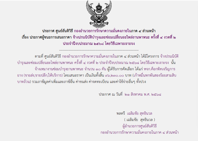 จัดซื้อ จัดจ้างประกาศผู้ชนะการเสนอราคา ประกาศผู้ชนะการเสนอราคา จ้างปรนนิบัติบำรุงและซ่อมเปลี่ยนอะไหล่ยานพาหนะ ครั้งที่ ๔ งวดที่ ๒ ประจำปีงบประมาณ ๒๕๖๘ โดยวิธีเฉพาะเจาะจง August 25, 2025 259 Share Facebook Twitter Google+ Telegram LINE