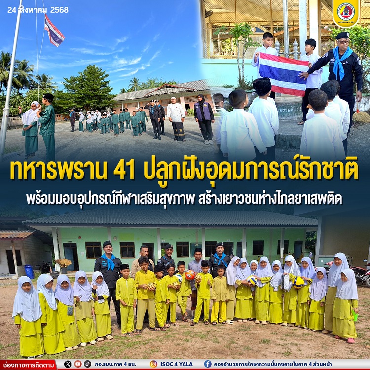 เมื่อวันที่ 23 สิงหาคม 2568 เวลา 08.00 น. ที่ ศูนย์การศึกษาอิสลามประจำมัสยิด (ตาดีกา) อำเภอรามัน จังหวัดยะลา หน่วยเฉพาะกิจกรมทหารพรานที่ 41 โดยผู้บังคับกองร้อยทหารพรานหน่วยขึ้นตรง พร้อมกำลังพลชุดปฏิบัติการกิจการพลเรือน ลงพื้นที่พบปะบุคลากรทางการศึกษา ครูสอนศาสนา และนักเรียน ร่วมกิจกรรมเคารพธงชาติหน้าเสาธง 5 นาที เพื่อปลูกฝังอุดมการณ์ความรักชาติ ศาสนา และสถาบันพระมหากษัตริย์ พร้อมเน้นย้ำการปฏิบัติตนให้อยู่ในกรอบของกฎหมาย และยึดหลัก “ความสงบ รู้รัก สามัคคี”