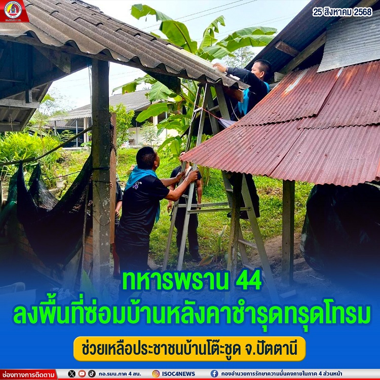 เมื่อวันที่ 24 สิงหาคม 2568 หัวหน้าชุดปฏิบัติการกิจการพลเรือน กองร้อยทหารพรานที่ 4406 หน่วยเฉพาะกิจกรมทหารพรานที่ 44 ได้นำกำลังพลเข้าช่วยเหลือประชาชนชุมชนไทยพุทธ บ้านโต๊ะชูด หมู่ที่ 6 ตำบลพิเทน อำเภอทุ่งยางแดง จังหวัดปัตตานี โดยได้เข้าดำเนินการซ่อมแซมส่วนของหลังคาบ้านของครอบครัวนางเอื้อน เพชรสุข ราษฎรซึ่งได้รับความเสียหายจากพายุลมแรง ทำให้กระเบื้องหลังคาถูกพัดหลุดหายไป สร้างความลำบากต่อการอยู่อาศัย หลังได้รับการประสานขอความช่วยเหลือ หน่วยทหารพรานจึงได้จัดชุดช่างของหน่วยเข้าพื้นที่เพื่อแก้ไขปัญหาอย่างเร่งด่วน