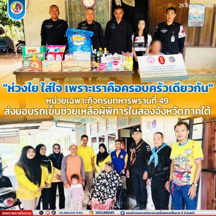 เมื่อวันที่ 25 สิงหาคม 2568 เวลา 13.00 น. พันเอก พัศวีร์ โปชะดา ผู้บังคับหน่วยเฉพาะกิจกรมทหารพรานที่ 49 พร้อมคณะ ได้นำรถเข็นนั่งไปมอบให้ นางสงวนกลิ่น บุญจันทร์ มารดาของ อาสาสมัครทหารพราน สหชัย บุญจันทร์ สังกัด กองร้อยทหารพรานที่ 4904 หน่วยเฉพาะกิจกรมทหารพรานที่ 49 ณ บ้านเลขที่ 130/1 หมู่ที่ 8 ตำบลพนางตุง อำเภอควนขนุน จังหวัดพัทลุง พร้อมทั้งยังได้มอบสิ่งของอุปโภคบริโภคและเงินบำรุงขวัญ เพื่อแสดงความห่วงใยและสนับสนุนครอบครัวของกำลังพลที่ประสบภาวะทุพพลภาพ ให้สามารถดำรงชีวิตได้