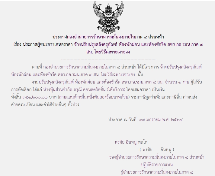 จัดซื้อ จัดจ้างประกาศผู้ชนะการเสนอราคา ประกาศผู้ชนะการเสนอราคา จ้างปรับปรึงครุภัณฑ์ ห้องพักผ่อน และห้องซักรีด สขว.กอ.รมน.ภาค ๔ สน. โดยวิธีเฉพาะเจาะจง ( ๓๕๑,๒๐๐.๐๐ บาท ) January 21, 2021 1039 Share Facebook Twitter Google+ Telegram LINE กอ.รมน.ภาค ๔ สน.