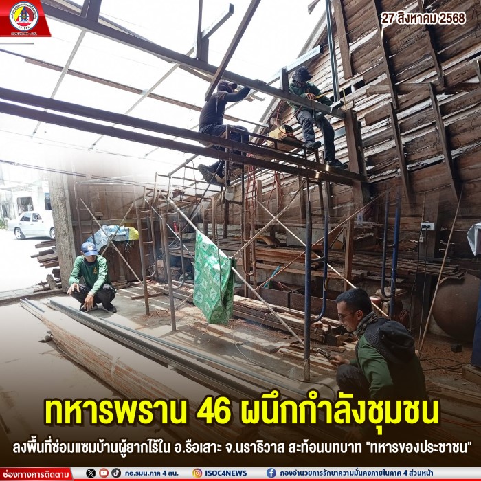 เมื่อวันที่ 26 สิงหาคม 2568 หน่วยเฉพาะกิจกรมทหารพรานที่ 46 นำกำลังพลชุดช่างกองร้อยทหารพรานที่ 4605 ลงพื้นที่ไปยังบ้านเลขที่ 156/1 หมู่ที่ 2 ตำบือรือเสาะ อำเภอรือเสาะ จังหวัดนราธิวาส เพื่อดำเนินการซ่อมแซมบ้านพักอาศัยให้กับ นางจิบ หมอกมัว ผู้ยากไร้และด้อยโอกาสในพื้นที่ การดำเนินการในครั้งนี้ได้ร่วมกับผู้นำหมู่บ้าน และประชาชนจิตอาสา ร่วมกันซ่อมแซมบ้าน ตามโครงการซ่อมแซมบ้านเรือนภายใต้นิคมสร้างตนเองอำเภอรือเสาะ เพื่อ บรรเทาความเดือดร้อนและยกระดับคุณภาพชีวิตของประชาชนกลุ่มเปราะบาง ให้สามารถอยู่อาศัยได้อย่างมั่นคง ปลอดภัย และมีศักยภาพในการดำรงชีวิตที่ดีขึ้น