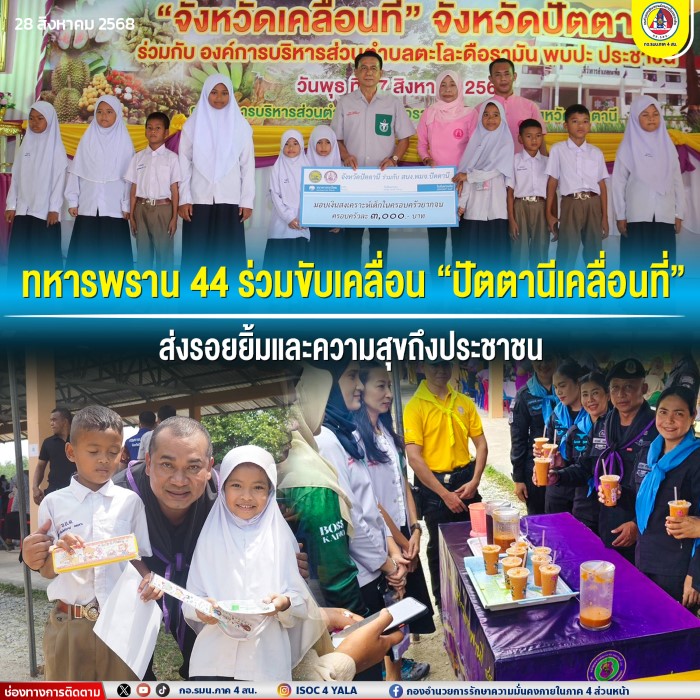 วันที่ 27 สิงหาคม 2568 เวลา 10.00 น. พันเอก ณัฐวุฒิ ศรีสังข์ ผู้บังคับหน่วยเฉพาะกิจกรมทหารพรานที่ 44 นำกำลังพลของหน่วยฯ ร่วมกับนายอำเภอกะพ้อ ส่วนราชการในพื้นที่ และพี่น้องประชาชน ร่วมให้การต้อนรับ นายไชยพร นิยมแก้ว รองผู้ว่าราชการจังหวัดปัตตานี ในโอกาสเดินทางมาเป็นประธานเปิดกิจกรรมโครงการหน่วยบริการ “จังหวัดปัตตานีเคลื่อนที่”