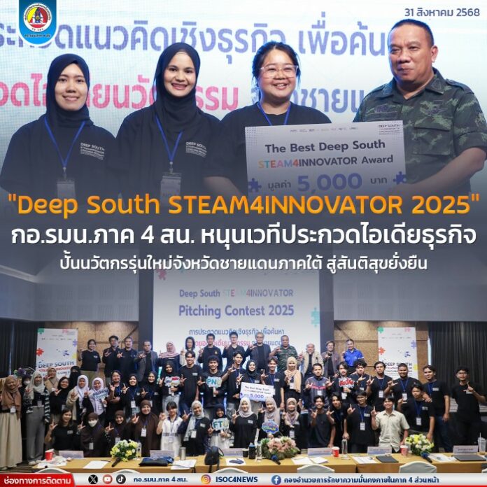 On 30 August 2025, at the Southern View Hotel, Mueang District, Pattani Province, Lieutenant General Paisan Nusang, Commander of the 4th Army Region and Director of the Internal Security Operations Command Region 4 (ISOC Region 4), delegated Colonel Prasatphop Hayakangchat, Deputy Commander of the Pattani Task Force, to represent him and honor the awards ceremony of the Deep South STREAM4INNOVATION Contest 2025. Colonel Prasatphop also addressed the youth participants of the program, which aims to discover outstanding business innovation ideas from the southern border provinces. The event reflects a strong commitment to developing analytical thinking, creativity, and business planning skills grounded in science, technology, and innovation.
