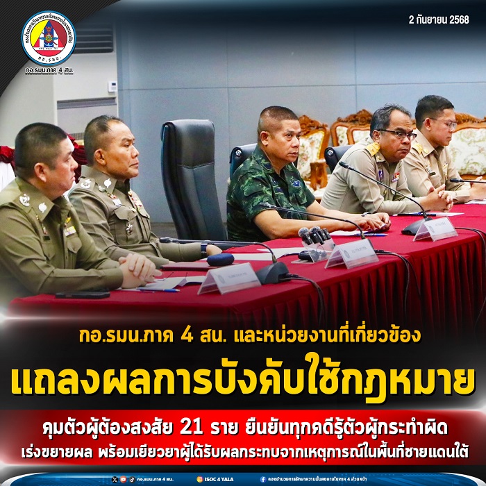 ISOC Region 4 Front Command and Relevant Agencies Announce Results of Law Enforcement Operations – 21 Suspects Detained, All Perpetrators Identified, Ongoing Investigation and Assistance for Affected Persons in the Southern Border Provinces