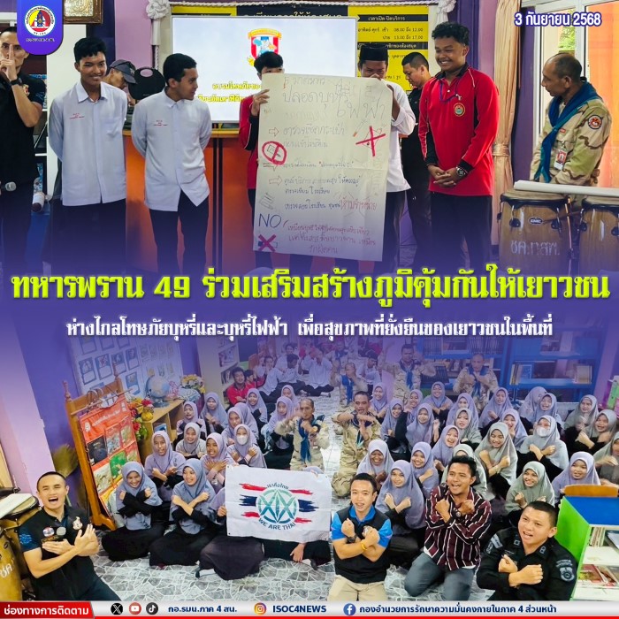 Pada 2 September 2568, jam 1.00 petang, Unit Khas Rejimen Askar Pran 49, diketuai oleh Leftenan Watit Wattanasan, Komander Kompeni 4901, bersama pasukan Operasi Hal Ehwal Awam, telah turut serta dalam program ceramah kesedaran bahaya rokok dan rokok elektronik (vape) di Sekolah Attaufiqiyah Islamiyah, Kampung Sako, Mukim Sako, Daerah Sri Sakhon, Wilayah Narathiwat.