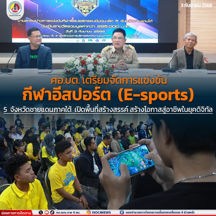 วันที่ 3 กันยายน 2568 ณ ห้องประชุมชั้น 2 ศูนย์ราชการจังหวัดชายแดนภาคใต้ อำเภอเมือง จังหวัดยะลา ศูนย์อำนวยการบริหารจังหวัดชายแดนภาคใต้ (ศอ.บต.) แถลงข่าว เตรียมจัดการแข่งขันกีฬาอีสปอร์ต (E-sports) รายการ GAMER GALAXY SOUTHERN PROVINCES E-SPORTS CHAMPIONSHIP SERIES รอบชิงชนะเลิศ 5 จังหวัดชายแดนภาคใต้ กำหนดจัดขึ้น ระหว่างวันที่ 13 – 14 กันยายน 2568 ณ สนามโรงพิธีช้างเผือก อำเภอเมือง จังหวัดยะลา ชิงเงินรางวัลมูลค่า 285,000 บาท โดยมี นายปิยะศิริ วัฒนวรางกูร รองเลขาธิการศูนย์อำนวยการบริหารจังหวัดชายแดนภาคใต้ เป็นประธานการแถลงข่าว พร้อมด้วย นาย แสนพล อู่วิเชียร รองอุปนายก สมาคมกีฬาอีสปอร์ตแห่งประเทศไทย, นายชัยภูมิ จันทร์วีรยุทธ ประธานชมรมยะลาอีสปอร์ตคลับ และส่วนราชการหน่วยงานในพื้นที่ร่วมแถลงข่าว ทั้งนี้เปิดพื้นที่สร้างโอกาสให้เยาวชนในพื้นที่ 5 จังหวัดชายแดนภาคใต้ สามารถเข้าถึงกิจกรรมสร้างสรรค์ที่พัฒนาอาชีพ เชื่อมโยงกับเศรษฐกิจดิจิทัล และช่วยเสริมสร้างพลังบวกในการรวมพลังเยาวชน ลดความเสี่ยงจากปัจจัยทางสังคม ตลอดจนช่วยยกระดับเศรษฐกิจในท้องถิ่นให้เติบโตอย่างยั่งยืนผ่านกีฬาอีสปอร์ต (E-Sports)