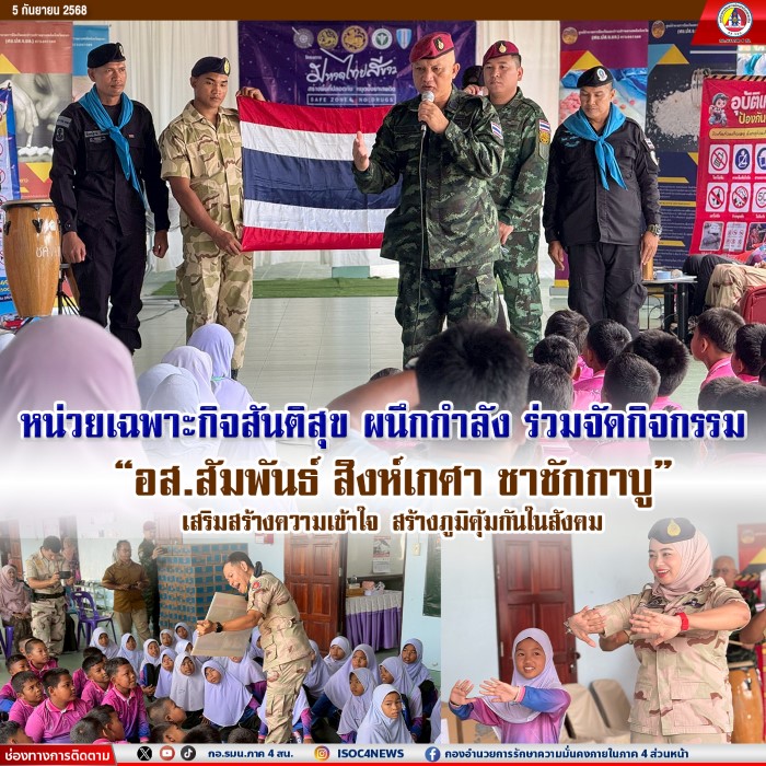 The Peacekeeping Task Force, through Peacekeeping Unit 302, in collaboration with Taskin Unity Control Unit 331, Ranger Company 4112 of the 41st Ranger Regiment Task Force, and Volunteer Defense Corps Company 5 of Raman District, jointly organized the event “Volunteer Unity: Singkesa Cha-Chak Gabu” at Ban Kuwo School, Village No. 4, Kototura Subdistrict, Raman District, Yala Province. The event was held under the framework of the project “White Ministry of Interior: Creating Safe Spaces, Combating Drug Abuse.”
