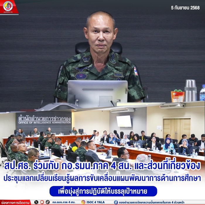 วันที่ 5 กันยายน 2568 เวลา 09.30 น. ที่ห้องประชุม 3 สำนักอำนวยการข่าวกรอง กองอำนวยการรักษาความมั่นคงภายในภาค 4 ส่วนหน้า พลตรี กรกฎ ภู่โชติ รองผู้อำนวยการรักษาความมั่นคงภายในภาค 4 ส่วนหน้า เป็นประธานการประชุมหารือแนวทางการขับเคลื่อน เชื่อมโยง และบูรณาการ “ฮูกุมปากัต (ธรรมนูญหมู่บ้าน ) 9 ดี ลงสู่การปฏิบัติในระดับพื้นที่ โดยใช้กลไกคณะกรรมการจังหวัด สู่การปฏิบัติร่วมกับสำนักงานปลัดกระทรวงศึกษาธิการ ร่วมกับ กองอำนวยการรักษาความมั่นคงภายในภาค 4 ส่วนหน้า และหน่วยงานที่เกี่ยวข้อง ร่วมกันขับเคลื่อน โดยมี นางสาวนวลพรรณ วรรณสุธี ผู้อำนวยการสำนักอำนวยการ สำนักงานปลัดกระทรวงศึกษาธิการ พร้อมด้วย คณะผู้บังคับบัญชา และฝ่ายอำนวยการของกองอำนวยการรักษาความมั่นคงภายในภาค 4 ส่วนหน้า, ผู้แทนศูนย์ขับเคลื่อนการศึกษาในพื้นที่จังหวัดชายแดนภาคใต้, ผู้แทนจากสำนักงานศึกษาธิการภาค 7, ผู้แทนสำนักศึกษาธิการจังหวัดยะลา ปัตตานี นราธิวาส สงขลา และส่วนเกี่ยวข้องเข้าร่วมประชุม เพื่อแลกเปลี่ยนเรียนรู้ผลการขับเคลื่อนแผนพัฒนาการศึกษาสู่การปฏิบัติร่วมกับสำนักงานปลัดกระทรวงศึกษาธิการ วัตถุประสงค์เพื่อบูรณาการ งานการศึกษาตามสายงานปกติกับเส้นปฏิบัติการด้านการศึกษาในพื้นที่จังหวัดชายแดนภาคใต้ โดยการบูรณาการทำงานแบบมีส่วนร่วมกับหน่วยงานในพื้นที่สู่การปฏิบัติให้บรรลุเป้าหมาย และเกิดผลสัมฤทธิ์ตามแผนพัฒนาการศึกษาในพื้นที่