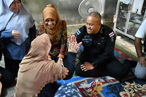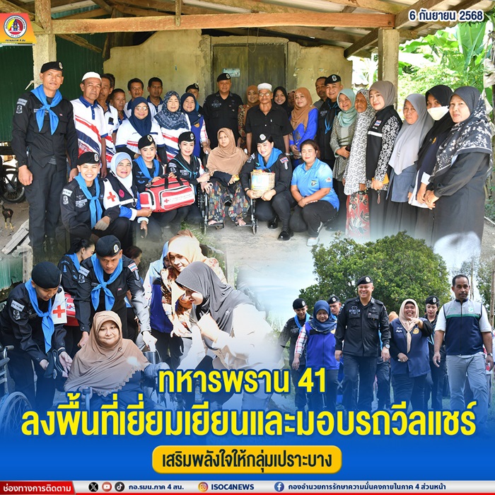 วันที่ 5 กันยายน 2568 เวลา 09.00 น. พันเอก จตุพร ธานีพัฒน์ ผู้บังคับหน่วยเฉพาะกิจกรมทหารพรานที่ 41 พร้อมด้วย ผู้บังคับกองร้อยทหารพรานที่ 4112, ผู้บังคับหมวดทหารพรานหญิง, ชุดปฏิบัติการกิจการพลเรือนหมวดทหารพรานหญิง และกำลังพลกองร้อยทหารพรานที่ 4112 ร่วมกับหน่วยงานภาครัฐและภาคประชาชน ได้แก่ ศูนย์แพทย์จังหวัดชายแดนภาคใต้, สมาคมคนพิการภาคใต้ จังหวัดยะลา, กำนัน/สารวัตรกำนัน, ผู้ใหญ่บ้าน, เจ้าหน้าที่ โรงพยาบาลส่งเสริมสุขภาพตำบล, อาสาสมัครสาธารณสุขประจำหมู่บ้าน (อสม.) และบัณฑิตอาสา ลงพื้นที่ อำเภอรามัน จังหวัดยะลา เพื่อพบปะเยี่ยมเยียนและให้กำลังใจประชาชนกลุ่มเปราะบาง จำนวน 2 ราย ประกอบด้วย