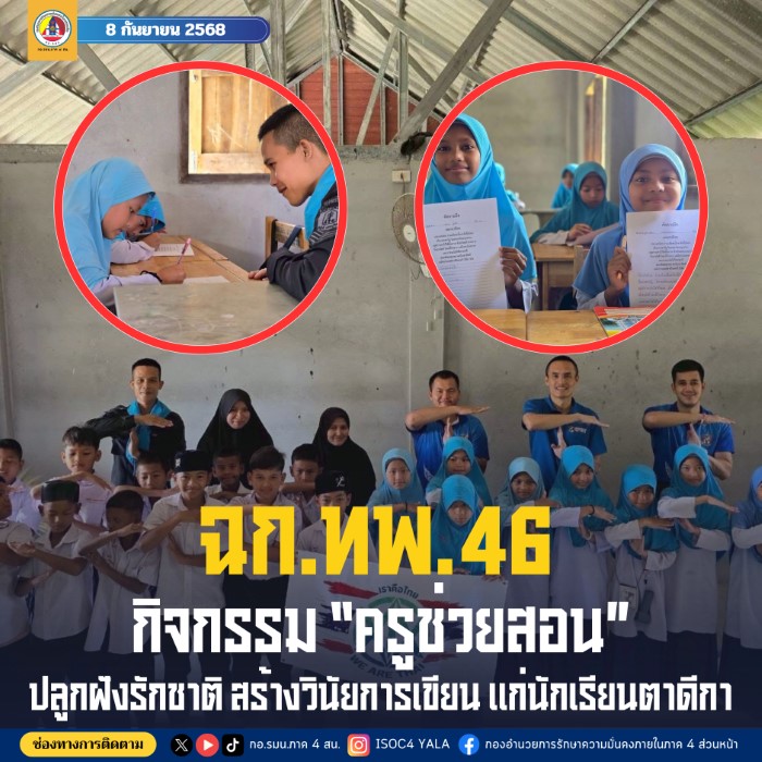 วันที่ 7 กันยายน 2568 ณ ศูนย์การศึกษาอิสลามประจำมัสยิด (ตาดีกา) ฟัรฏูอีนมูฮำมาดียะห์ บ้านสโลว์ หมู่ 7 ตำบลรือเสาะ อำเภอรือเสาะ จังหวัดนราธิวาส กองร้อยทหารพรานที่ 4604 หน่วยเฉพาะกิจกรมทหารพรานที่ 46 ร่วมกับชุดสันติสุข 406 จัดกิจกรรม “ครูช่วยสอน” เพื่อพัฒนาสัมพันธ์กับครูสอนศาสนาและนักเรียนในพื้นที่