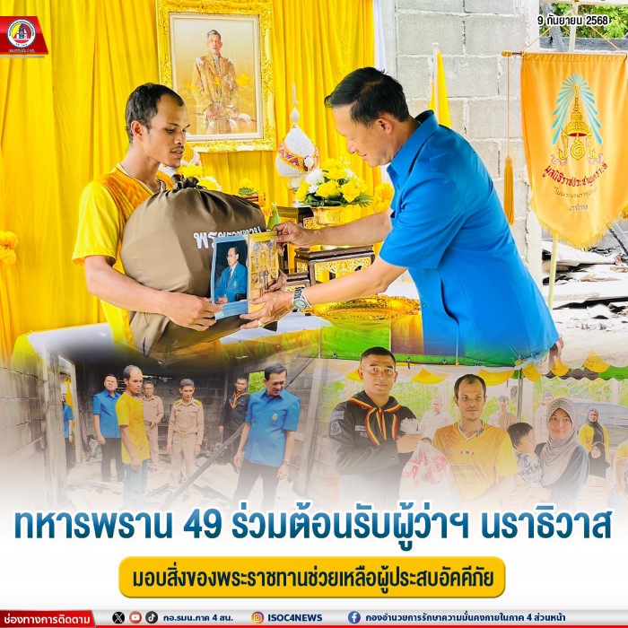 วันที่ 8 กันยายน 2568 เวลา 13.00 น. หน่วยเฉพาะกิจกรมทหารพรานที่ 49 มอบหมายให้ ร้อยเอก สุภาพ มณีฉาย ผู้บังคับกองร้อยทหารพรานที่ 4912 พร้อมด้วยกำลังพลชุดปฏิบัติการกิจการพลเรือน ร่วมกับส่วนราชการอำเภอศรีสาคร, ส่วนราชการตำบลเชิงคีรี, ผู้นำท้องที่, ผู้นำท้องถิ่น และประชาชนในพื้นที่ ร่วมให้การต้อนรับ ว่าที่ร้อยตรี ตระกูล โทธรรม ผู้ว่าราชการจังหวัดนราธิวาส ได้กรุณาให้เกียรติเดินทางมาเป็นประธานในพิธีมอบ สิ่งของพระราชทานจากมูลนิธิราขประชานุเคราะห์ในพระบรมราชูปถัมภ์ เพื่อช่วยเหลือบรรเทาความเดือดร้อนแก่ นายมะยูโซ๊ะ แซยามิง ผู้ประสบเหตุอัคคีภัย พร้อมทั้งมอบสิ่งของอุปโภคบริโภคเพิ่มเติมให้แก่ครอบครัวผู้ประสบภัย ณ บ้านเลขที่ 185 หมู่ที่ 2 บ้านตามุง ตำบลเชิงคีรี อำเภอศรีสาคร จังหวัดนราธิวาส
