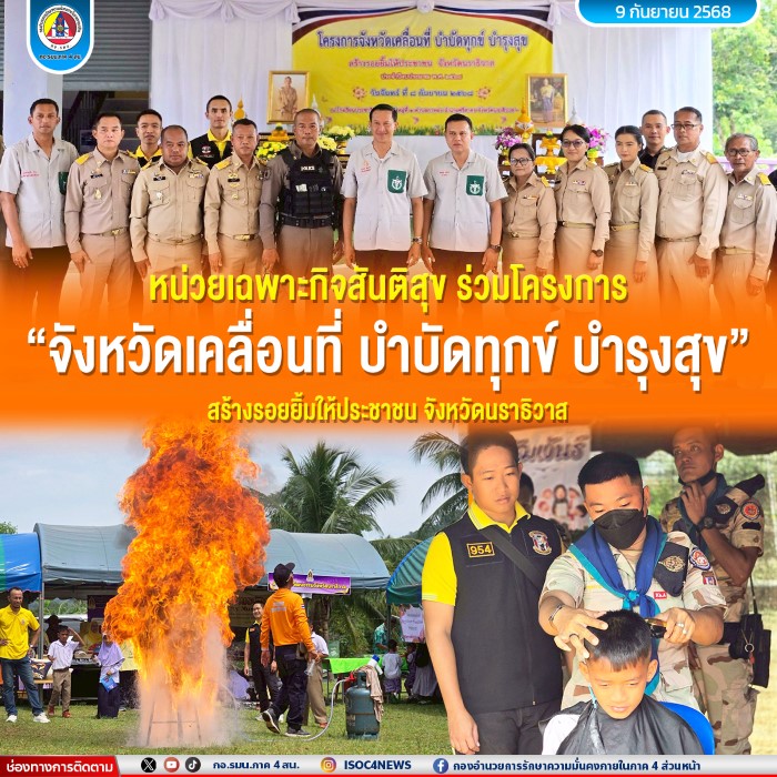 หน่วยเฉพาะกิจสันติสุข โดย ชุดสันติสุขที่ 406, ชุดควบคุมทักษิณสัมพันธ์ที่ 441 พร้อมด้วยหน่วยงานราชการในพื้นที่ ร่วมกิจกรรม “โครงการจังหวัดเคลื่อนที่ บำบัดทุกข์ บำรุงสุข สร้างรอยยิ้มให้ประชาชน” ซึ่งจัดขึ้นที่ โรงเรียนประชาวิทยรังสรรค์ หมู่ 1 ตำบลกาหลง อำเภอศรีสาคร จังหวัดนราธิวาส เพื่อให้ประชาชนในพื้นที่ห่างไกลหรือพื้นที่เข้าถึงยาก ได้รับบริการจากภาครัฐอย่างทั่วถึง อาทิ การให้คำปรึกษาทางกฎหมาย การแพทย์ขั้นพื้นฐาน บริการทะเบียนราษฎร รวมถึงการสอบถามความต้องการและปัญหาในชีวิตประจำวันของประชาชน เพื่อให้หน่วยงานสามารถตอบสนองได้อย่างตรงจุด โดยมี ว่าที่ร้อยตรี ตระกูล โทธรรม ผู้ว่าราชการจังหวัดนราธิวาส เป็นประธานในพิธีเปิด